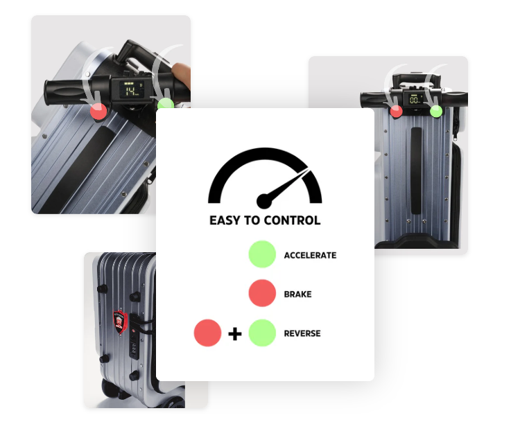 Comparison of electric suitcase configurationsModel204S284S206206LRunning distance15km15km15km15kmCharging time1-2h1-2h1-2h1-2hMax speed13km/h13km/h13km/h15km/hGearshigh, lowhigh, lowhigh, medium, lowhigh, medium, lowLoad-bearing capacity90Kg et weight 9kg, including battery90kg110Kg (net weight 9.35kg, including battery)110Kg et weight 9.9kg, including batteryBattery capacity97wh97wh97wh97whPower250W250W300W300WLifting cushionsnonononoSize54cm*21cm*3lcm61cm*39cm*29.5cm50cm*21cm*35cm54cm*24cm*35cmBox materialSteel frame+ABS+PUCarbon steel frame+ABS+PUAluminium alloy+ABS+PUAluminium alloy+ABS+PUType of lockTSA CODED LOCKTSA CODED LOCKTSA CODED LOCKTSA CODED LOCKHandle Length/ Pulling bar length24cm/34cm10cm/38cm10cm/38cm14cm/40cmwheel diameterFront wheel: 10cm*1pc Rear wheel: 10cm*2pcsFront wheel: 10cm*1pc Rear wheel: 10cm*2pcsFront wheel: 15cm*1pc Rear wheel: 14cm*2pcsFront wheel: 15cm*1pc Rear wheel: 13cm*2pcsDisassembled or notyesyesyesyesFeaturesCan carry on boarding, attery display, running, and slow gears.Can carry on boarding, attery display, running, and slow gears.Can carry on boarding, rumpet, running and slow gears, lectronic Brake, ront shock absorberCan carry on boarding, attery display, running, and slow gears. -